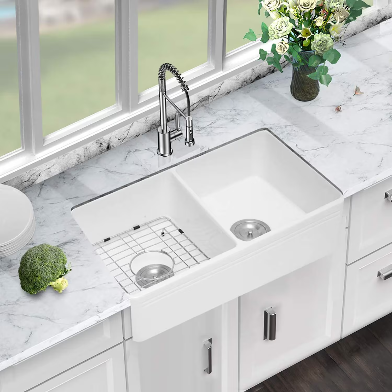 White in color, the kitchen sink is sharp, stylish, and features a convenient double-bowl design.Made of cast ceramic, the 33" kitchen sink is a durable addition to any home. The material's resistance to heat and scratches makes it perfect for a frequently used kitchen. Our products are inspired by vintage farmhouse sinks that create a distinctive clean look. It will not rust, fade, or discolor, providing beauty and durability.